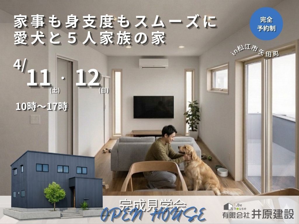井原建設【完成見学会】家事も身支度もスムーズに愛犬と5人家族の家|4月11日(土)12日(日) 松江市矢田町